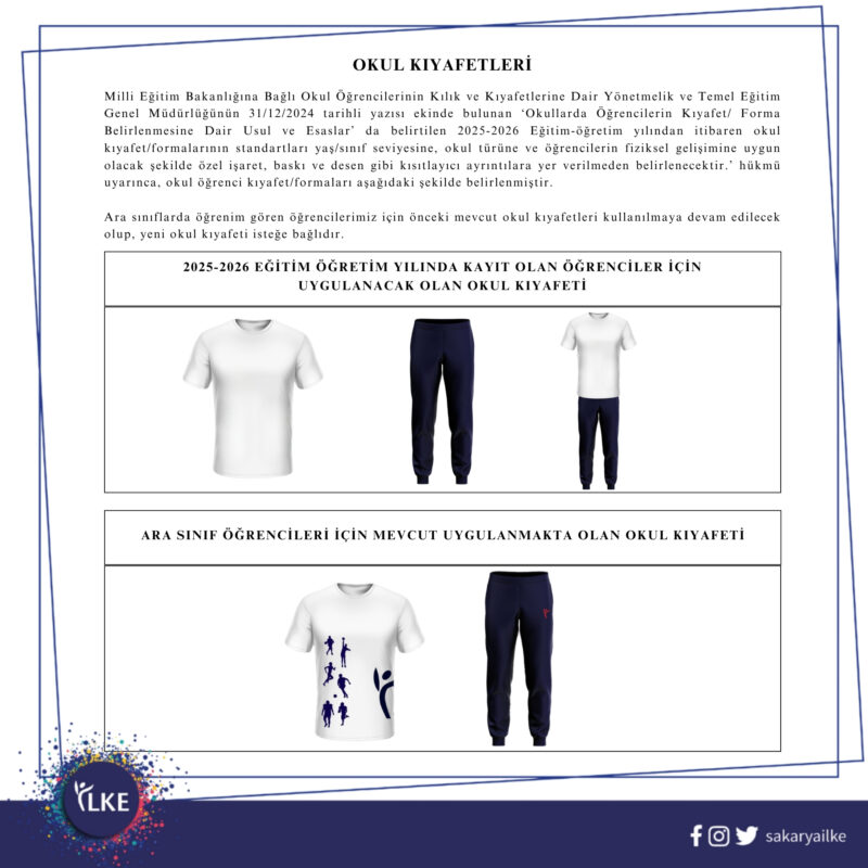 26 Aralık 2024 tarihinde yayınlanan “Millî Eğitim Bakanlığına Bağlı Okul Öğrencilerinin Kılık ve Kıyafetlerine Dair Yönetmelikte Değişiklik Yapılması Hakkında Yönetmelik “2025-2026 eğitim-öğretim yılından itibaren 1 ve 5. sınıfa başlayacak öğrencilerimizin okul kıyafeti okul aile birliği kurulunda ve öğretmenler kurulunda değerlendirilmiş ve kararlaştırılmıştır. 2025-2026 eğitim öğretim yılında 1 ve 5. sınıf öğrencilerimiz için okul kıyafeti olarak lacivert alt kıyafet, beyaz renk tişört, lacivert renk mont veya hırka belirlenmiştir. Ana sınıfı öğrencilerimiz serbest kıyafet, ara sınıf öğrencilerimiz ise mevcut kıyafetleri ile devam edebileceklerdir.